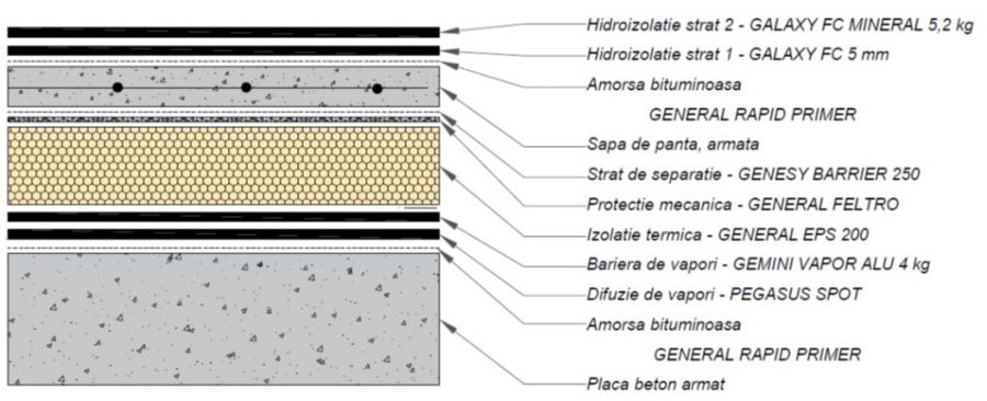 Solutie tehnica acoperis necirculabil, termoizolat, cu hidroizolatia la vedere.