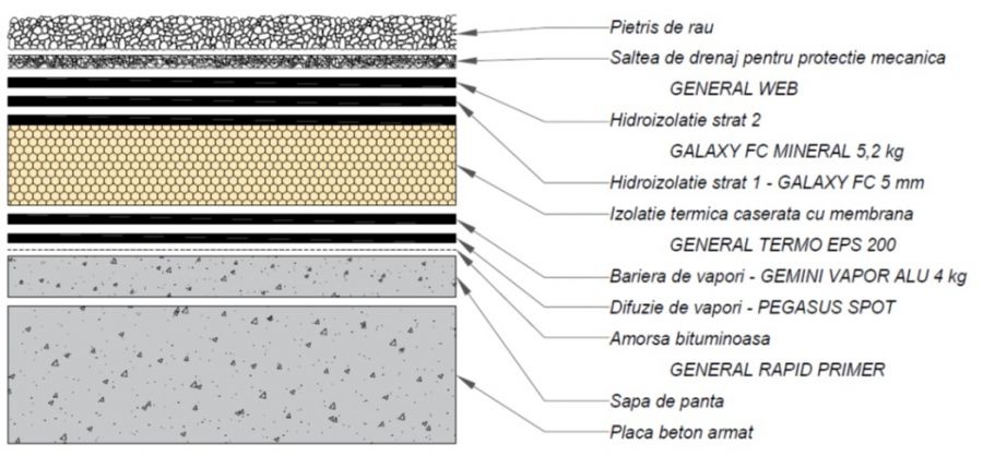 Solutie tehnica pentru un acoperis necirculabil, pietonal fix, suport beton monolit, lestare cu pietris