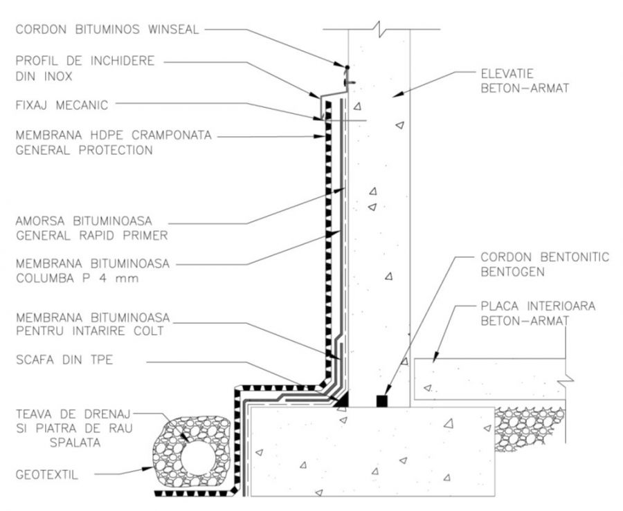 Solutie tehnica pentru pereti ingropati, cu membrana bituminoasa si protectie mecanica.