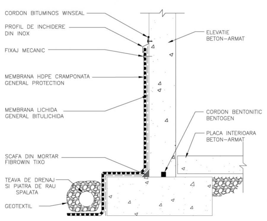 Solutie tehnica pentru pereti ingropati, cu membrana lichida si protectie mecanica
